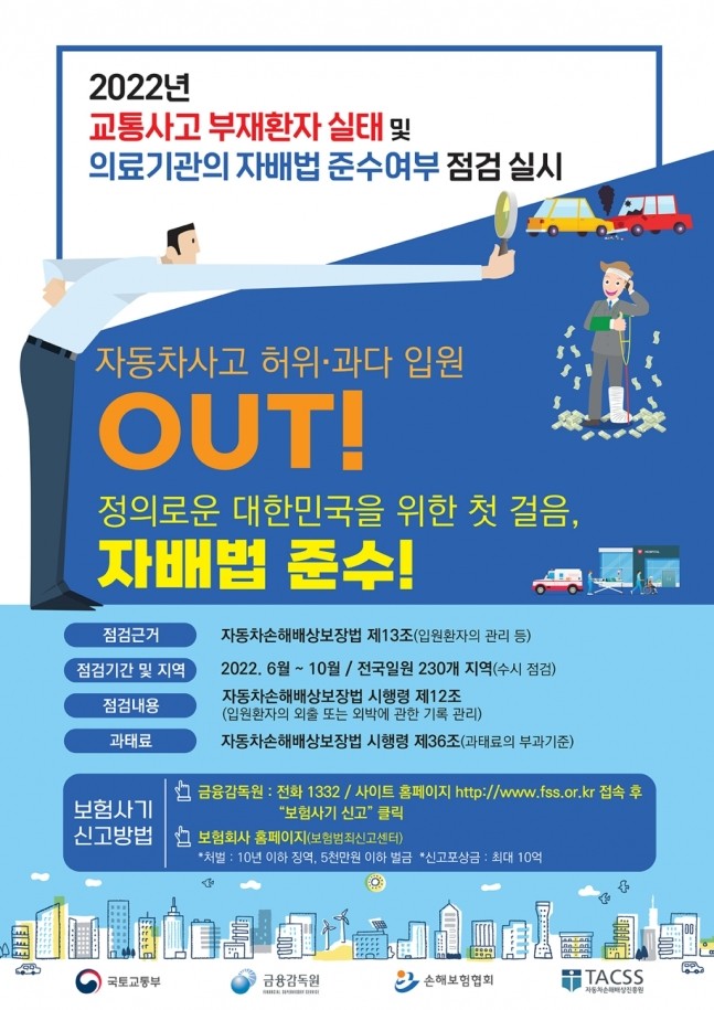 자동차 사고 관련 허위과다 입원, 과다청구 등 보험사기를 신고하고자 하는 시민은 금융감독원 전화와 홈페이지 ‘보험사기 신고’에서 접수할 수 있고 보험회사 홈페이지(보험범죄신고)에서도 신고할 수 있다.