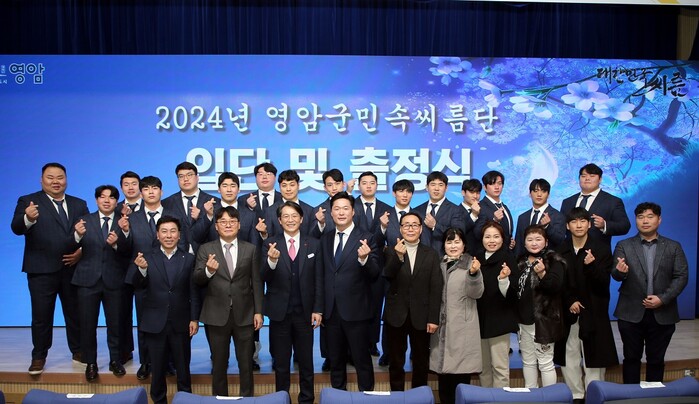 | ▲ 우승의 영암군수(앞줄 왼 쪽부터 세 번째) 지난 1월 13일 영암군 민속씨름단 입단 및 출정식에 참석해 씨름단 관계자 등과 기념촬영을 하고 있다. / 영암군 제공 |