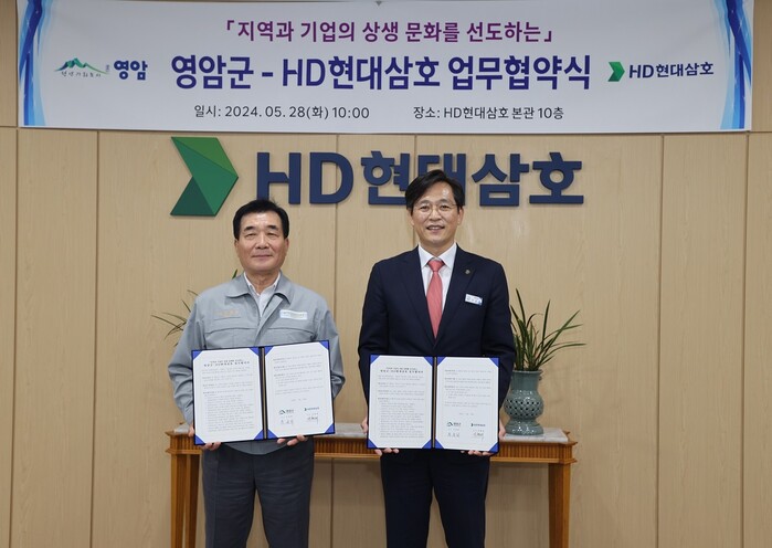 | ▲ 우승희 영암군수(오른 쪽)가 지난 5월 28일 HD현대삼호와 정주인구 확대, 지역인재 채용, 고향사랑기금사업 발굴 등을 위해 함께 노력하는 상생 업무협약을 맺고 기념촬영 / 영암군 제공 |