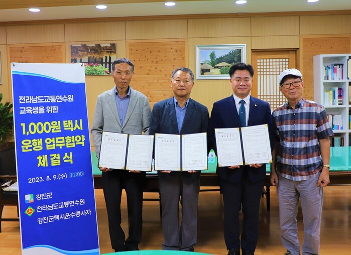 [강진=정찬남 기자] 전남 강진군은 지난 9일, 전라남도교통연수원, 강진군택시운수종사자와 함께 ‘전라남도교통연수원 교육생을 위한 천원 택시 운행’ 업무협약을 체결했다.