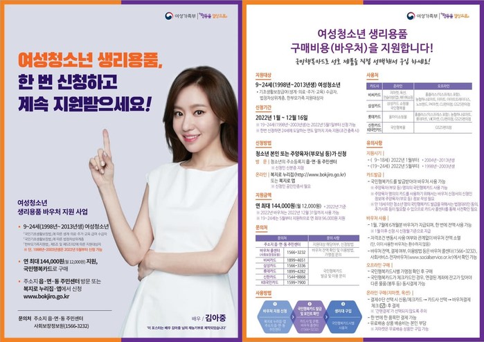 여성청소년 보건위생물품 지원사업은 2018년 생리대를 현물로 지원하던 사업에서 지원받는 여성청소년의 편의성과 정서적 불편함을 해소하기 위해 2019년부터 바우처(이용권)를 지원하는 사업으로 변경되어 운영되고 있으며, 2021년까지는 만11~18세 여성청소년을 지원했으나 금년부터는 만9~24세 여성청소년으로 대상이 확대되어 운영된다.