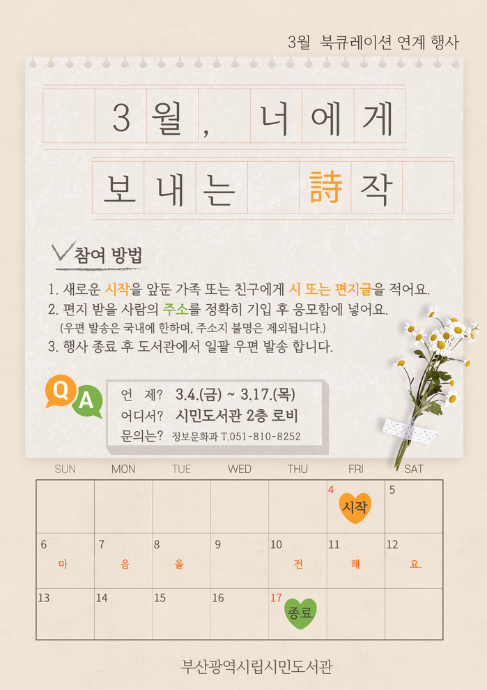 [부산=최성일 기자] 부산광역시립시민도서관은 4일부터 오는 17일까지 도서관 2층 로비에서 시민들을 대상으로 '3월, 너에게 보내는 시작(詩作)' 행사를 연다.