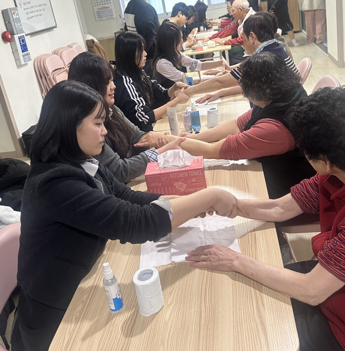 이번 재능기부 봉사는 안산국제비즈니스고등학교 미용과의 교육과정과 연계한 지역교육생태계 조성을 위한 교육 봉사의 일환으로 마련됐으며, 학생과 교직원 15여 명이 학교 인근 장상3경로당을 직접 찾아가 어르신들에게 손 마사지 및 네일아트 서비스를 제공하며 효사랑을 실천하는 뜻깊은 시간을 가졌다.