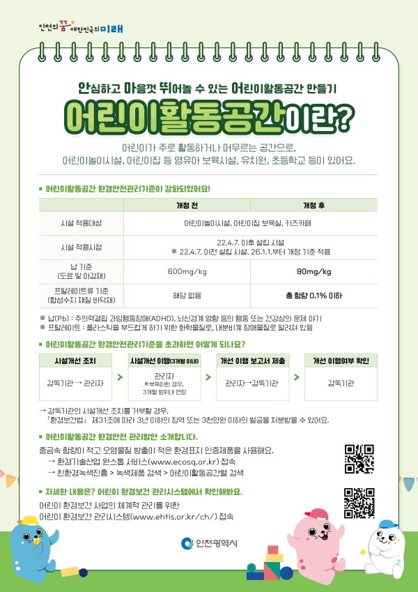 김철수 환경국장은 “어린이는 환경 유해인자에 취약하므로 이번 특별 사전 환경 안전진단을 통해‘환경 노출에 민감한 어린이들이 안심하고 마음껏 뛰어놀 수 있는 인천’이 될 수 있도록 시가 앞장서서 노력하겠다”고 말했다.
