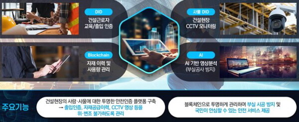 이 서비스는 조작이 불가능한 블록체인 기술을 기반으로 증명된 현장 인력 출입 관리, 인증된 자재 이력 관리, 폐쇄회로(CC)TV, 사물인터넷(IoT)센싱, 인공지능(AI) 등 통합관제 기술을 아파트 건설 현장에 적용해 투명한 공사관리가 이뤄지게 하는 서비스다.