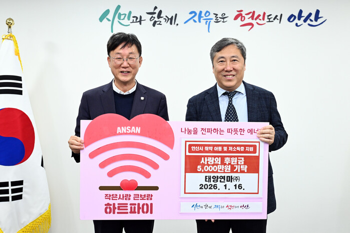 이민근 안산시장은 “어려운 경영 여건 속에서도 매년 잊지 않고 지역사회를 위해 성금을 쾌척해 주신 태양연마(주) 신석호 사장님께 진심으로 감사드린다”며 “보내주신 성금은 꼭 필요한 곳에 따뜻한 마음을 담아 전달하겠다”고 화답했다.