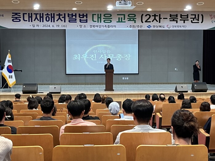 [구미=박병상 기자] 경북행복재단은 지난 19일 도내 사회복지시설 관계자 및 중대재해처벌법 담당 공무원 200명 대상으로「중대재해처벌법 대응 교육」을 경북여성가족플라자(예천)에서 실시하였다.