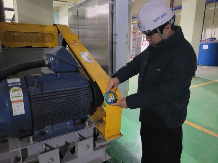| 인천환경공단 안전담당자가 설비에 ‘Safe-방울’을 부착하고 있다. [사진=인천환경공단] |