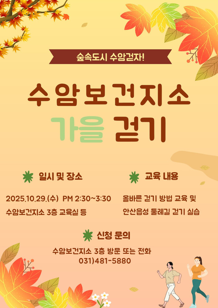 ‘수암 가을 걷기 교실’은 오는 29일(수) 오후 2시 30분부터 3시 30분까지 지역주민 50명을 대상으로 진행된다.