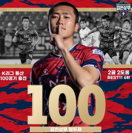 [김천=박병상 기자] 경북 김천상무프로축구단이 지난 2일 김천종합운동장에서 열린 ‘하나원큐 K리그2 2023’ 30R 충북청주FC와 홈경기에서 0대 0으로 무승부를 거뒀다. 이날 원두재는 교체 출전해 개인 K리그 통산 100경기를 달성했다.