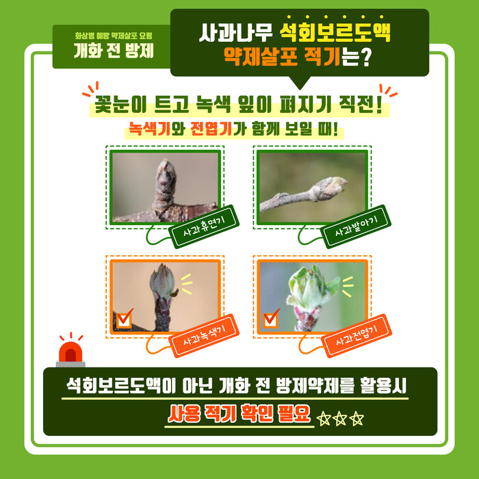 사과는 눈이 발아하여 녹색기와 전엽기가 함께 보일 때, 배는 발아기와 전엽기 사이가 개화 전 약제 살포 적기인데 올해는 평년보다 겨울철 온도가 높아 꽃 피는 시기도 앞당겨질 것으로 예상되므로 약제살포 준비를 서둘러야 한다.
