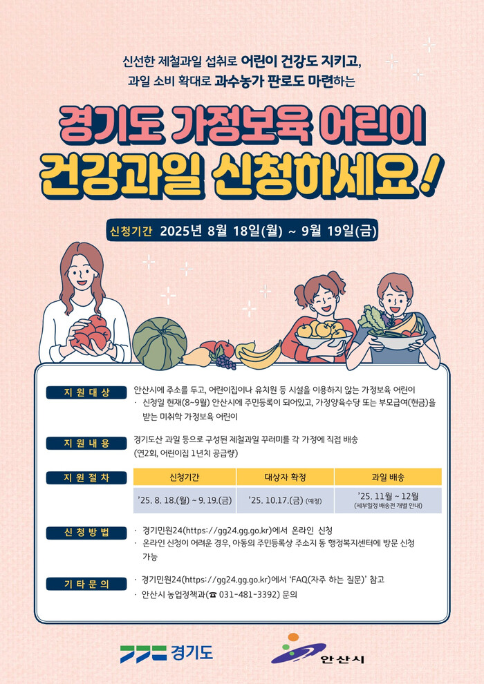 자격 검증이 거쳐 최종 선정된 대상자는 11월에서 12월까지 어린이집 아동에게 지원하고 있는 과일의 연간 물량을 꾸러미 형태로 2회에 걸쳐 가정으로 배송받게 된다. 자세한 사항은 안산시청 누리집을 참고하거나, 농업정책과로 문의하면 안내받을 수 있다.