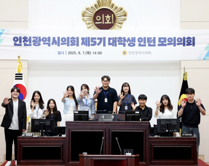 인천시의회는 7일 본회의장에서 대학생 인턴 10명과 의회 관계자 등이 참석한 가운데 하계 대학생 인턴십 프로그램 일환으로 ‘모의의회’를 개최했다.