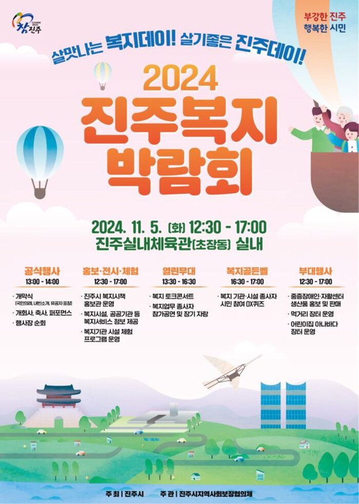 진주시가 주최하고 진주시지역사회보장협의체(위원장 김병윤)가 주관하는 ‘2024 진주복지박람회’가 11월 5일 낮 12시 30분 진주실내체육관(초장동)에서 개최된다.