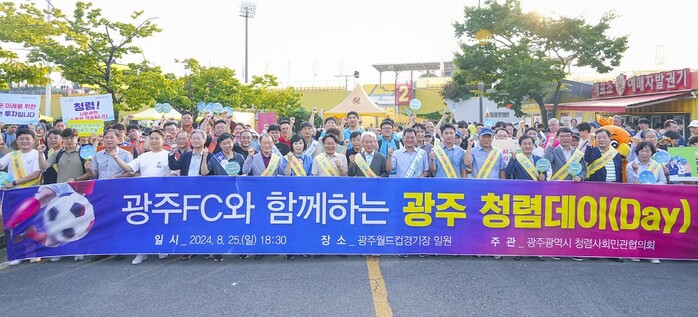 | ▲ 강기정 광주광역시장(사진 앞줄 가운데)이 지난 25일 오후 서구 광주축구전용구장에서 열린 ‘광주FC와 함께하는 광주 청렴데이(Day)’에 참여해 축구 관람객들을 대상으로 캠페인을 펼치고 있다. /광주광역시 제공 |