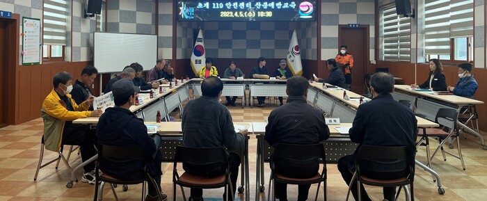 이명기 센터장의 설명으로 진행된 이번 교육에서는 생활쓰레기 및 영농부산물 불법 소각, 논밭두렁 태우기, 화목보일러 재 불씨 등 주요 산불 원인과 산불예방을 위한 생활지침을 중점 당부했다.
