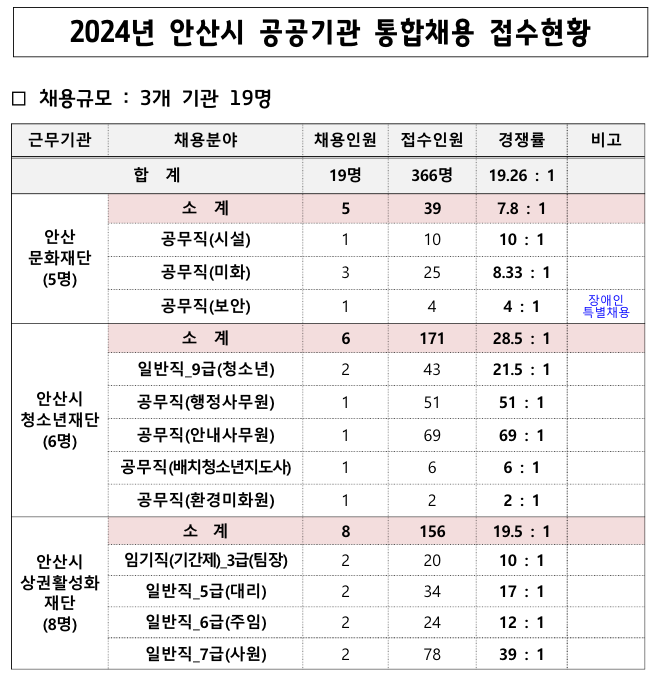 지난달 22일부터 28일까지 2024년 안산시 산하 공공기관 정기 통합채용 응시원서를 접수한 결과 3개 기관 19명 선발에 총 366명이 접수했다.
