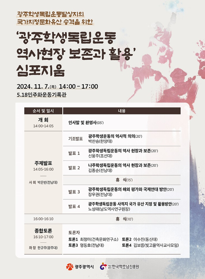 심포지엄에서는 학생독립운동의 역사적 의의와 가치(박찬승 한양대 교수), 광주학생독립운동의 역사현장과 보존(신웅주 조선대 교수), 나주학생독립운동의 역사현장과 보존(김종순 전 나주시 문화예술과장), 학생독립운동의 해외평가와 국제연대(장우권 전남대 교수), 학생독립운동의 국가지정유산 승격방안(노성태 남도역사연구원장) 등을 발표한다. 주제발표에 이어 한규무 광주대 교수를 좌장으로 종합토론이 진행된다.