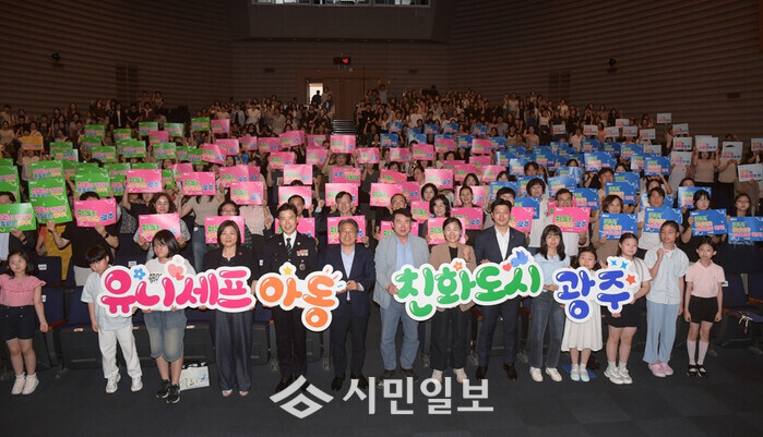 | ▲ 강기정 광주광역시장(왼 쪽 첫 번째)이 지난 2025년 7월31일 오후 시청 대회의실에서 열린 유니세프 아동친화도시 상위인증 선포식에 참석해 기념촬영을 하고 있다. /광주광역시 제공 |