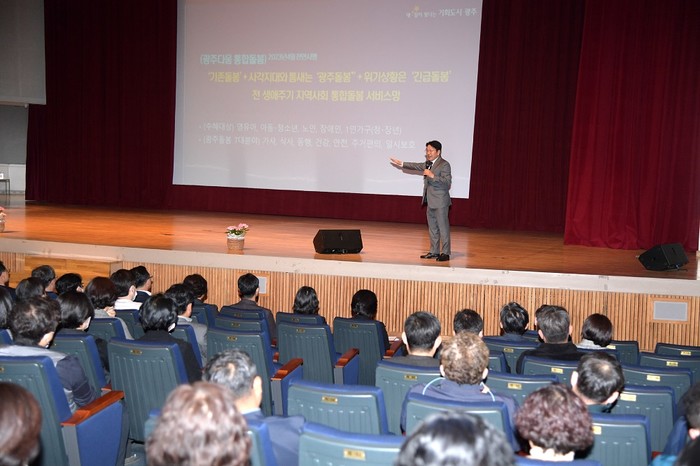 김 주무관은 사례를 중심으로 전반적인 광주다움 통합돌봄 서비스체계 모형과 신청 방법·대상·민간서비스와의 차별점 등을 설명하고 “광주다움 통합돌봄은 단순히 돌봄서비스 몇 가지를 신설하는 사업이 아니라 돌봄 문제가 생겼을 때 해결할 수 있는 시스템을 구축하는 것이 목표”라며 “시민들이 돌봄 위기에 놓였을 때 도움을 청할 곳을 마련하고 행정이 나서서 돌봄 계획을 수립하여 계획에 따라 민간 제공기관이 서비스를 지원하는 일련의 돌봄서비스 체계를 구축하는 것”이라고 강조했다.