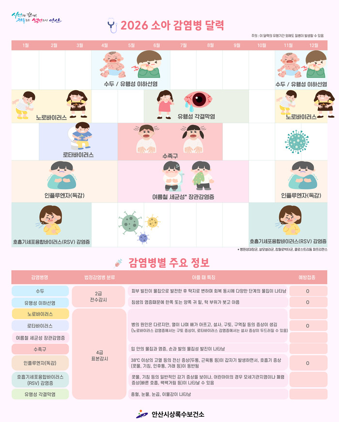 특히 이번에 배포되는 ‘소아 감염병 달력’은 시기별 주요 감염병 정보를 한눈에 확인할 수 있도록 구성됐다. 피부 발진, 고열, 구토 등 주요 증상과 법정 감염병 분류 정보가 상세히 수록돼 있어 현장에서의 조기 발견과 대처에 큰 도움이 될 것으로 기대된다.