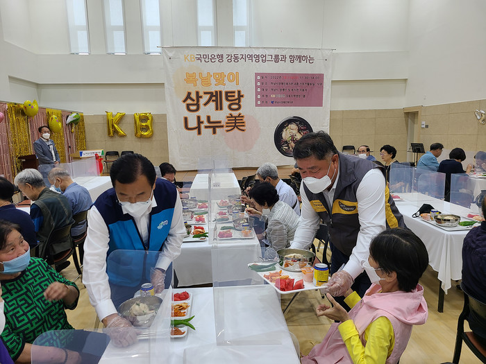 경기 하남시장애인복지관은 최근 KB국민은행 강동지역그룹의 후원을 받아 장애인 및 복지관 이용인 400명을 초청해 삼계탕 나누美 행사를 진행했다. 사진은 행사에 참여한 이현재 시장(왼쪽 두번째)이 음식을 대접하고 있는 모습.(사진제공=하남시청)