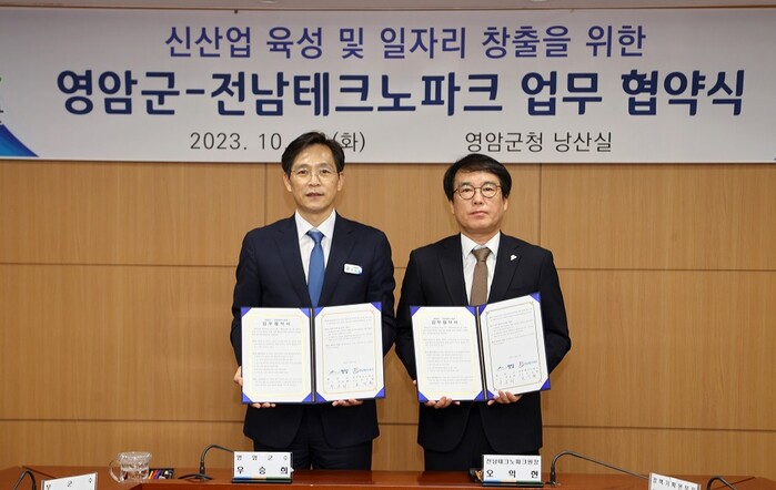 [영암=정찬남 기자] 전남 영암군(군수 우승희)이 지난 10일 군청에서 전남테크노파크(원장 오익현)와 ‘신산업 육성 및 영암군 일자리 창출 업무협약’을 체결했다.