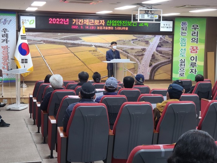 청주시가 14일 농업기술센터 농심관에서 공원관리과 기간제근로자 48명을 대상으로 산업안전보건교육을 실시했다.