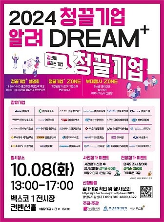 부산시(시장 박형준)는 내일(8일) 오후 1시 30분 벡스코 제1전시장 컨벤션홀에서 「부산 청끌(청년이 끌리는) 기업 알려 드림(DREAM)+」을 개최한다고 밝혔다.