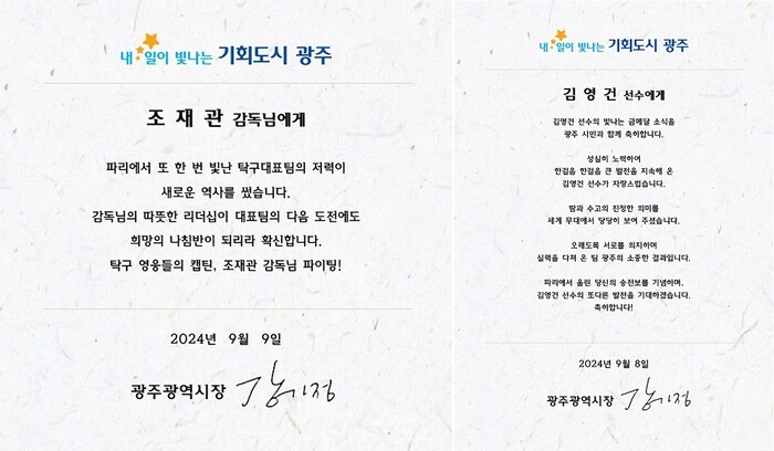 강기정 시장은 이날 광주시 소속 선수단에 축하 메시지를 보내 “파리에서 보여준 혼신의 노력이 새로운 희망의 사다리를 놓았다”며 “우리의 가슴을 뛰게 한 열여섯 영웅들의 파리이야기를 잊지 않고 기억 하겠다”고 응원했다.