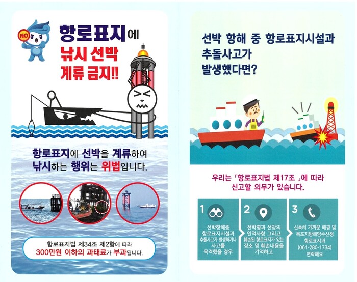| ▲ 항로표지낚시선박계금금지홍보리플릿(출처=목포지방해양수산청) |