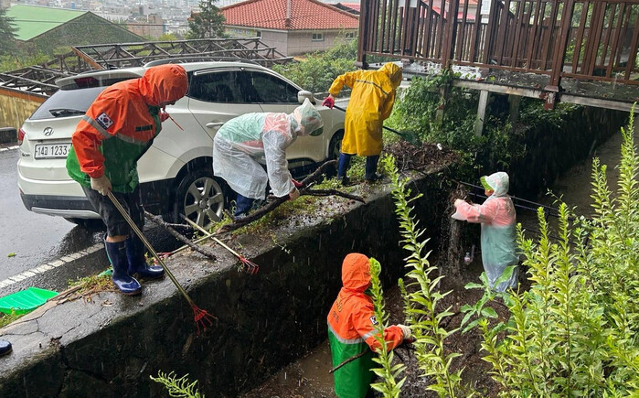 진주시 상봉동 자율방재단(단장 설대호)은 지난 21일 집중호우로 인한 피해를 방지하기 위하여 산복도로 배수로를 정비했다.