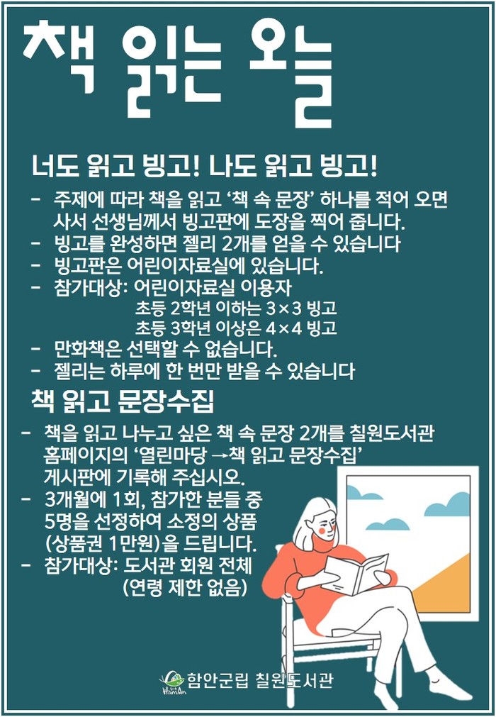 함안 군립 칠원 도서관은 독서로 일상에 활력을 주고자 올해 1월부터 ‘책 읽는 오늘’ 프로그램을 운영하고 있다고 밝혔다.