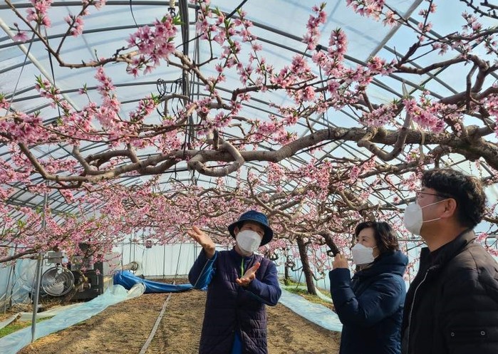 농업기술센터는 2021년 복숭아 시설하우스에 0.38ha 규모의 ‘지중 냉온풍 활용 시설과수 비용절감 시범사업’을 추진해 지중 냉온풍 장치 설치를 통한 저·고온기 생리장해 예방 기술을 보급했다. 이 기술로 겨울철 가온 시 난방비 절감 효과가 복숭아꽃을 피우는데 한몫했다.