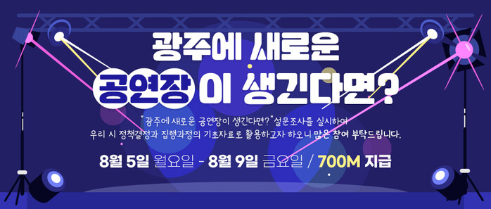 ‘광주에 새로운 공연장에 대한 당신의 의견은?’이라는 주제로 실시하는 설문조사는 광주에 새로운 공연장이 필요하다고 생각하는지, 새로운 공연장이 생긴다면 어떤 장르를 선호하는지, 공연장 건립 찬반 의견은 어떤지 등을 듣는다.