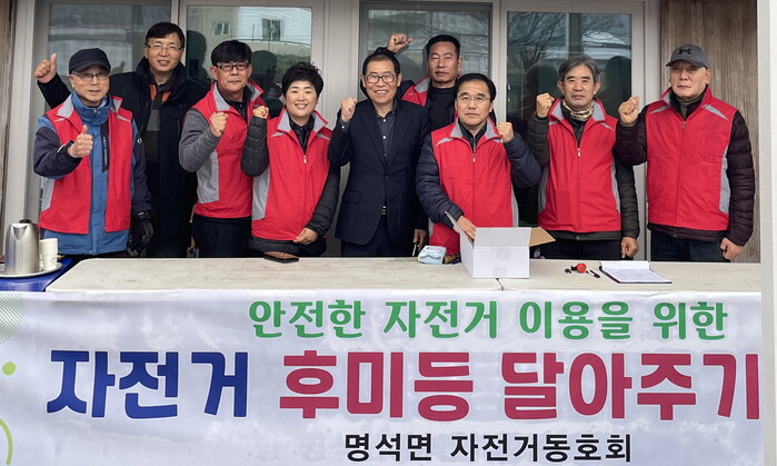진주시 명석면 자전거동호회(회장 박명래)는 11일 면사무소에서 면민들의 안전한 자전거 이용 문화 정착을 위한 ‘자전거 후미등 달아주기 행사’를 실시했다.