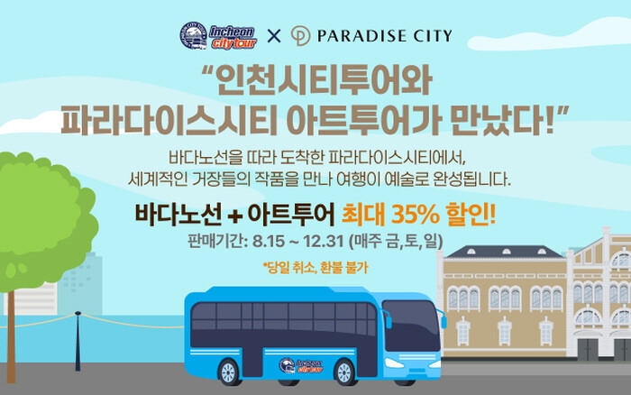 15일부터 운영되는 이번 제휴상품은 인천시티투어의 인기 노선인 바다 노선과 파라다이스시티의 아트 도슨트 투어를 한번에 즐길 수 있는 것이 특징이다.