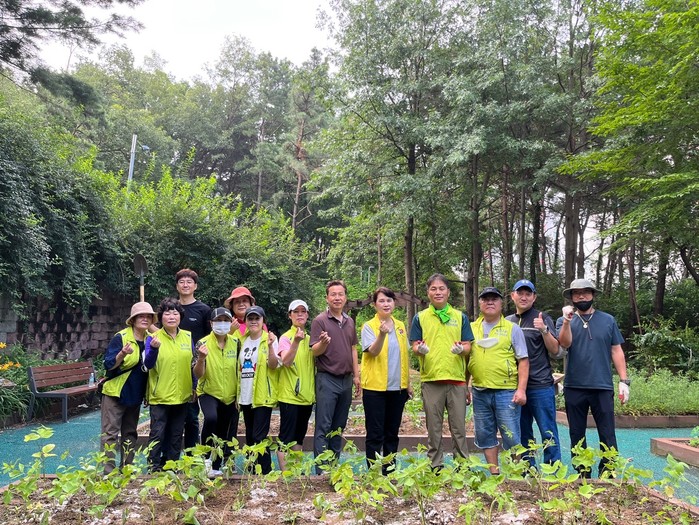 경기 양주시 회천3동 주민자치위원회는 최근 봉우근린공원내 회천3동 마을정원 가꾸기의 일환으로 약초정원과 테마정원을 풍성하게 가꾸기 위해 약도라지, 신선초 등 약초와 엑티네시아, 백합 등 꽃묘를 식재했다. 사진은 이날 참여한 주민위원들이 기념촬영을 하는 모습.(사진제공=양주시청)