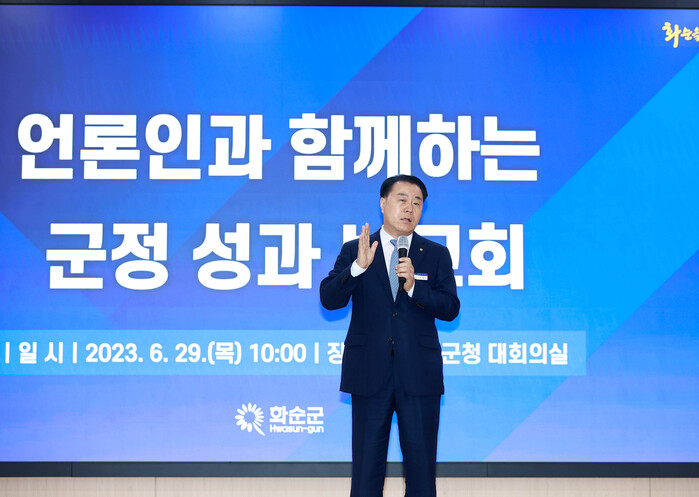 ‘언론인과 함께하는 군정 성과 보고회’란 주제로 개최된 이날 보고회는 화순군 일반현황, 역점사업, 주요성과 및 우수시책을 설명한 후, 기자들과 질의·답변하는 공감대화 순으로 마무리됐다.