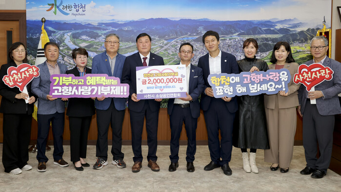 이번 기부는 합천군 소상공인연합회와 사천시 소상공인연합회의 지속적인 상호 협업 및 발전을 위해 뜻을 모았으며, 회원들 모두는 고향사랑기부의 활성화를 염원하면서 자발적으로 선착순 기부에 동참하게 됐다.