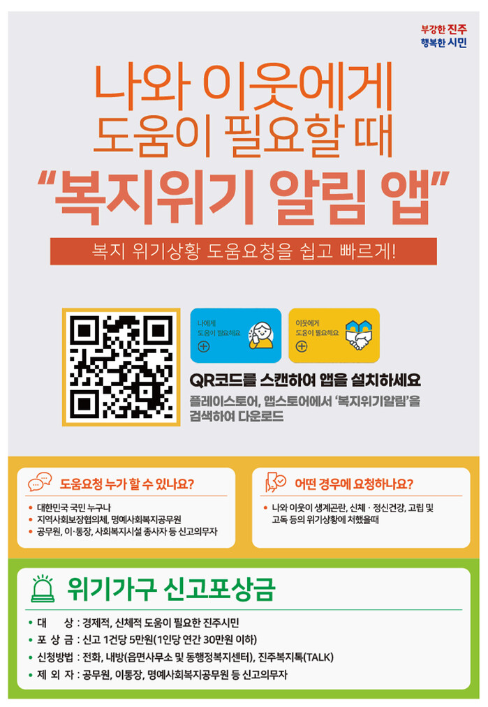 이웃의 위기상황을 발견했다면 누구나 읍·면사무소 및 동 행정복지센터에 설치된 전담 창구에 신고할 수 있으며, 진주복지콜센터(055-754-1001), 진주복지톡(TALK) 또는 ‘복지위기 알림 앱’을 통한 온라인 신고도 가능하다.