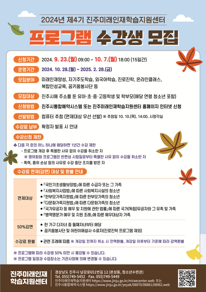 진주미래인재학습지원센터는 9월 23일부터 10월 7일까지 진주시통합예약시스템과 센터 홈페이지를 통해 ‘2024년 제4기 프로그램’ 수강생을 모집한다.