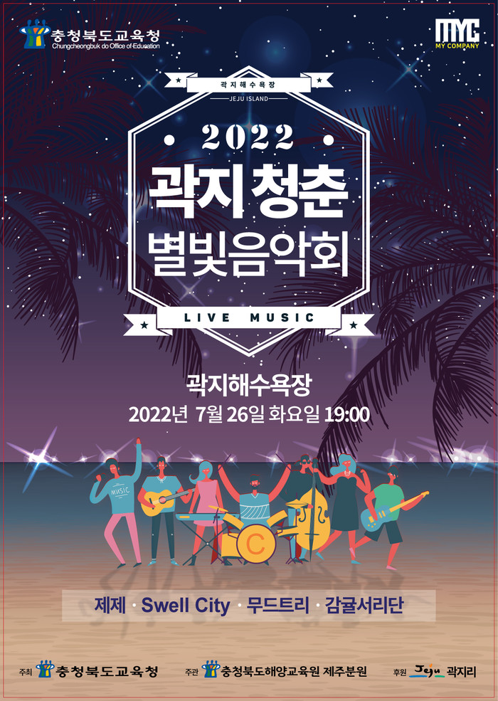 [청주=엄기동 기자] 충청북도해양교육원 제주분원은 26일(화) 19시 제주시 애월읍 곽지해수욕장 해변무대에서 충청북도 학생, 제주시교육청 학생, 곽지리 주민 등 200여명이 관람하는 ‘2022. 곽지 청춘 별빛음악회’를 개최한다.