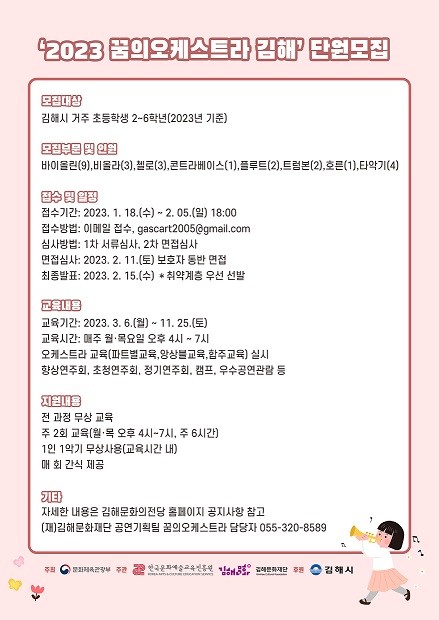 이번 신규 모집 대상은 김해시 거주 초등학생 2~6학년이다. 선발 규모는 총 25명이며, 바이올린(9명), 비올라(3명), 첼로(3명), 콘트라베이스(1명), 플루트(2명), 트럼본(2명), 호른(1명), 타악기(4명)을 모집한다.