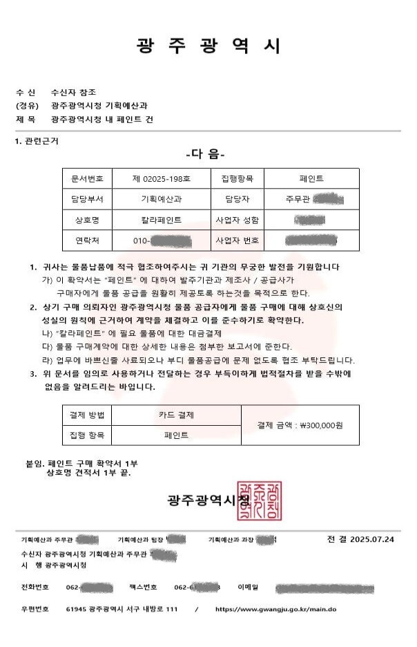 광주시 관계자는 “공무원이 민간업체에 일방적으로 연락해 계약을 체결하거나 물품을 요구하는 일은 절대 없다”며 “의심스러운 상황이 발생하면 해당 기관에 직접 확인하고 피해를 입었을 경우 즉시 경찰 등에 신고해 달라”고 당부했다.