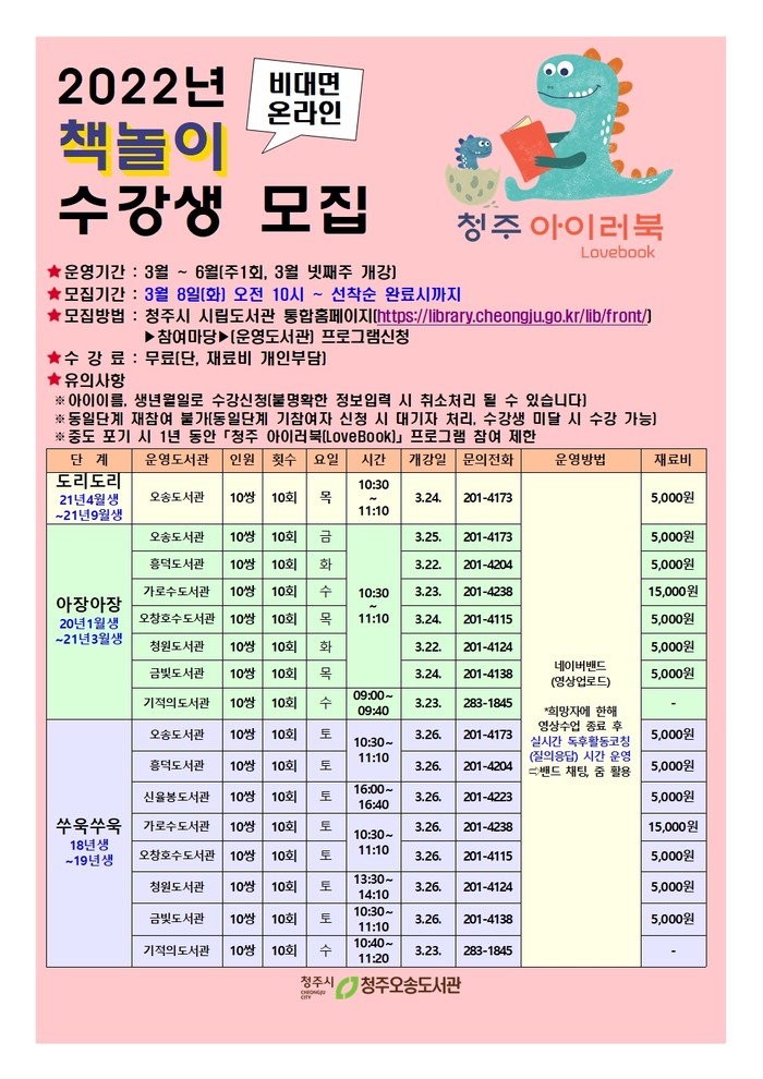 청주시도서관이 2022년 청주 아이러북(LoveBook) 상반기 책놀이 수강생을 3월 8일(오전 10시)부터 모집한다.