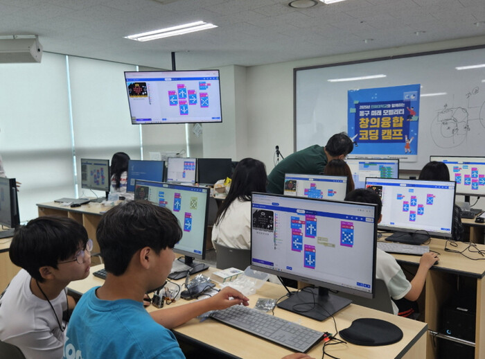 | 인하 위드아이 청소년 진로지원센터와 인천 동구청이 함께 마련한 ‘모빌리티 창의융합 캠프’에서 학생들이 수업을 듣고 있다. |