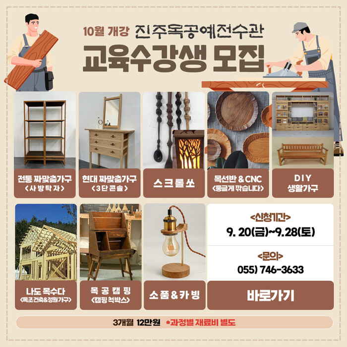 진주목공예전수관은 9월 20일부터 28일까지 2024년 4분기 교육프로그램 수강생을 모집한다.