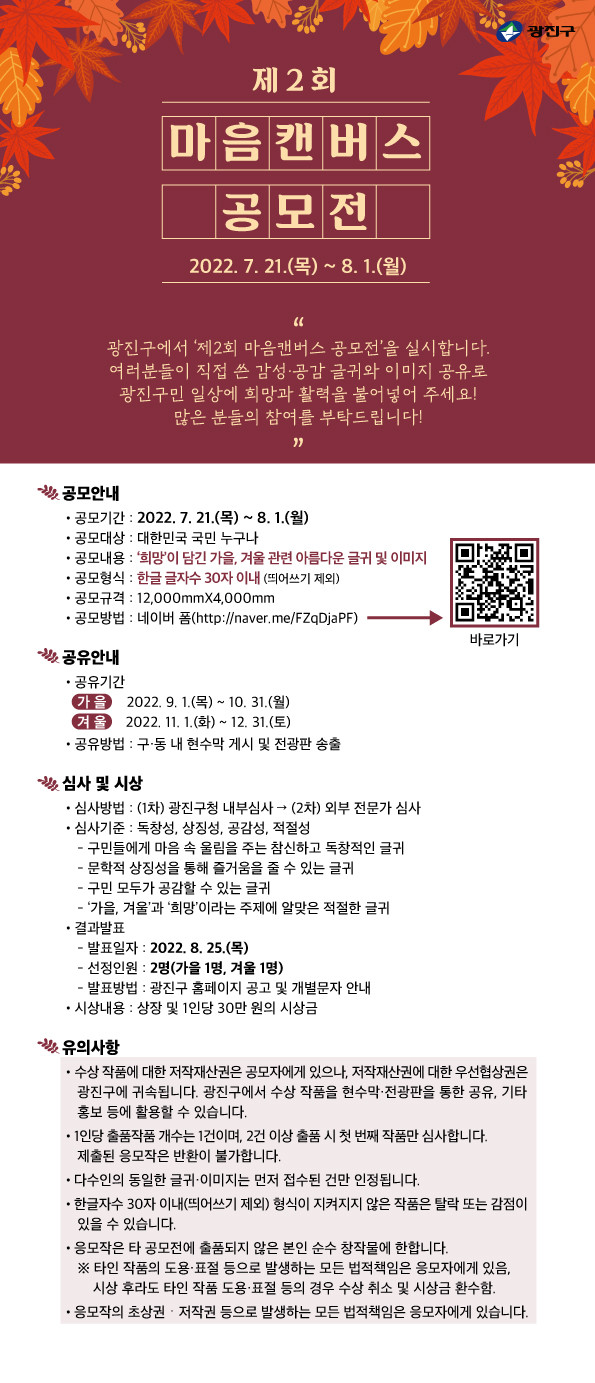 김경호 구청장은 “제1회에 이어, 가을과 겨울 문안을 공모하는 제2회 마음캔버스 공모전을 실시한다”며 “희망글귀를 통해 광진구의 가을과 겨울을 더욱 따뜻하게 만들어주실 분들의 많은 참여를 기대한다”고 말했다.