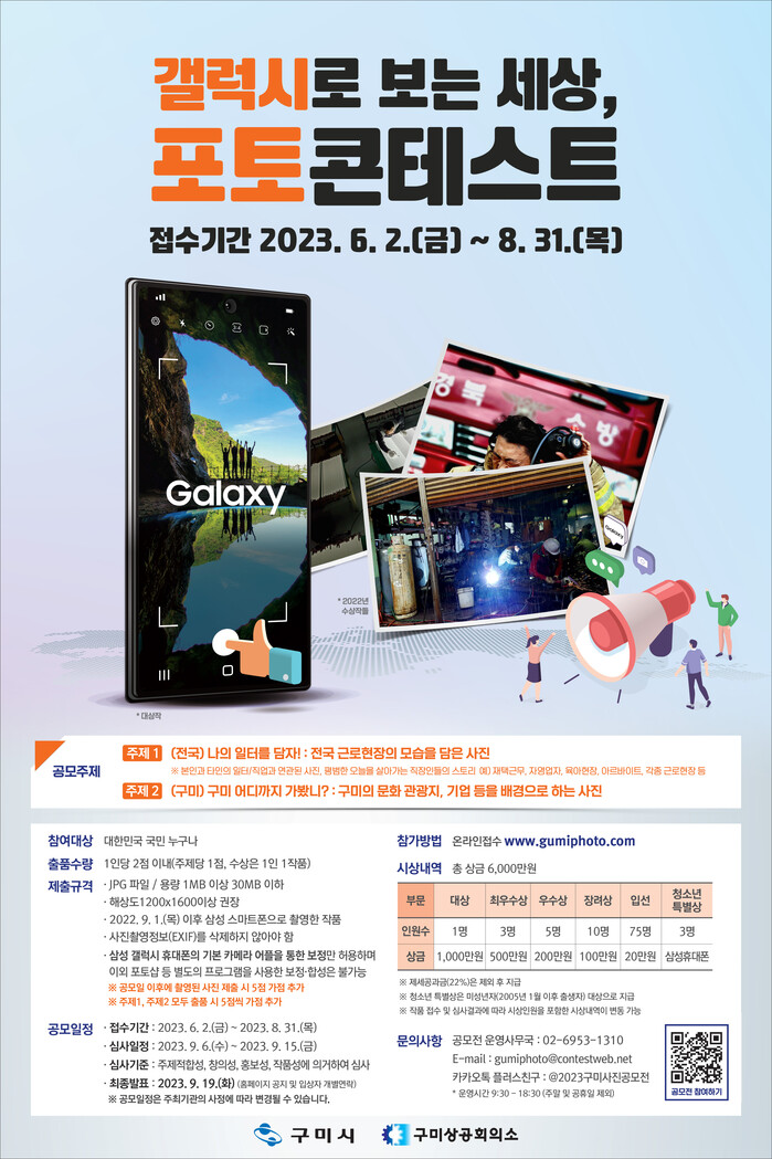 본 공모전은 별다른 참가 자격의 제한은 없으나 반드시 삼성 갤럭시 스마트폰을 활용하여 촬영한 22년 9월 1일 이후 사진을 출품하여야 하며, 공모주제는 전국 근로 현장의 모습을 담은 ‘주제1. 나의 일터를 담자!’와 구미의 문화 관광지, 기업 등을 배경으로 하는 ‘주제2. 구미 어디까지 가봤니?’ 두 가지 주제로 1인당 2점(주제당 1점) 이내로 출품 가능하다.